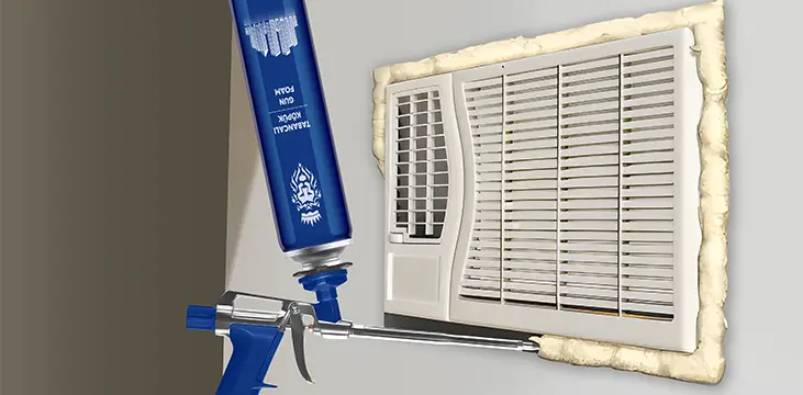 Mit einer Spritzpistole aufgetragener Bauschaum füllt Fenster-, Tür- und Wandspalten vollständig aus und reduziert so den Wärmeverlust. Er hält den Innenraum bei kaltem Wetter warm und bei heißem Wetter kühl.
